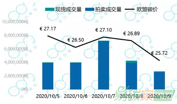 2020年10月5日至10月9日,歐盟碳價(jià)從27.17歐元下跌至25.72歐元每噸。