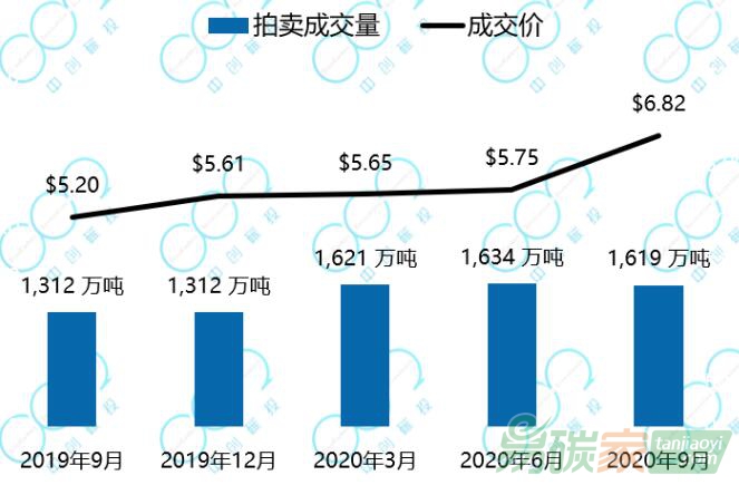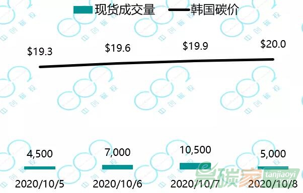 2020年10月5日至10月9日,韓國(guó)碳上漲至20.0美元每噸,成交量顯著減少。