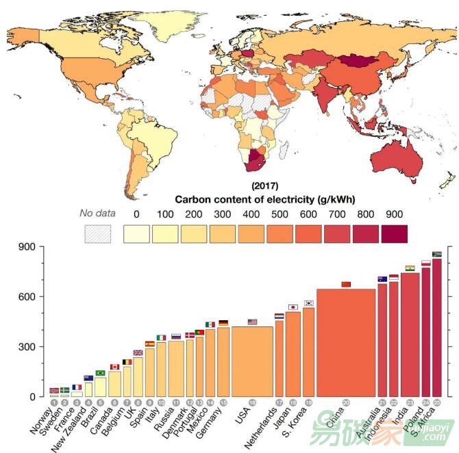 目前,全球主要國家的供電碳排放從低到高大致分成幾個(gè)類型:1、近零排放國家(100克以下):挪威、瑞典、瑞士、法國等;2、超低排放國家(100克到200克之間):新西蘭、加拿大、奧地利、芬蘭、丹麥、比利時(shí)等;3、低排放國家(200克到300克之間):英國、匈牙利、西班牙、葡萄牙、意大利等;4、中排放國家(300克到500克之間):德國、荷蘭、智利、美國、捷克、土耳其、墨西哥、以色列、日本等;5、高排放國家(500克以上):韓國、希臘、愛沙尼亞、中國、印度、波蘭、澳大利亞、南非等。