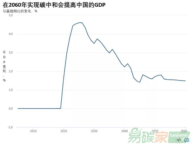 凈零計(jì)劃下中國(guó)GDP水平相對(duì)于基線的變化,%。(圖片來(lái)源:Cambridge Econometrics modelling)