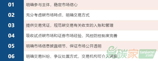 首先,《辦法》提出了全國碳排放權(quán)登記、交易和結(jié)算的基本要素,并以這三個環(huán)節(jié)為脈絡(luò),對市場各個參與主體設(shè)置了監(jiān)管框架,以便對其進行規(guī)范,這也是后續(xù)市場監(jiān)管的依據(jù)。