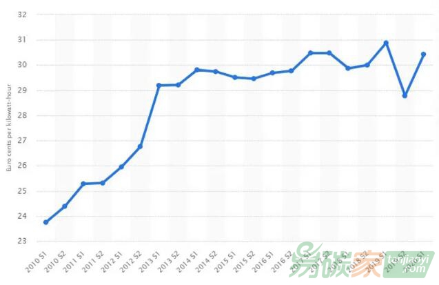 在德國(guó)的電力系統(tǒng)中,可再生能源的裝機(jī)已經(jīng)超過(guò)了一半。但可再生能源的發(fā)電量只占到電網(wǎng)總電量的三分之一左右。伴隨著可再生能源越來(lái)越高的比例,德國(guó)的電價(jià)也是水漲船高。2010年至今,德國(guó)電價(jià)增長(zhǎng)了約30%?,F(xiàn)在的德國(guó)電價(jià)水平是全歐洲第二高的。