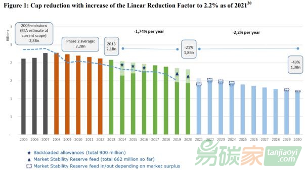 在18日發(fā)布的公告中,歐盟委員會(huì)對(duì)于歐盟第四階段的配額總供給Cap也進(jìn)行了具體說明。首先確定了每年的配額總供給的線性遞減系數(shù)(linear reduction factor, LRF) 由現(xiàn)行的1.74%從2021年提高為2.2%。同時(shí)考慮到英國(guó)脫歐,所以2021年度起歐盟碳