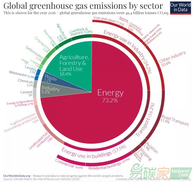 VisualCapitalist根據(jù)世界資源研究所的2016年數(shù)據(jù)制作了信息圖,顯示全球溫室氣體排放的來源。