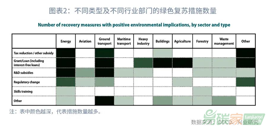 根據(jù)經(jīng)合組織(OECD)在2020年8月的初步分析[4],至少有30個經(jīng)合組織國家和主要合作伙伴國家[5]已將旨在支持向綠色經(jīng)濟轉(zhuǎn)型的措施作為其恢復計劃或戰(zhàn)略的一部分,這些措施主要包括以下四類:一是通過直接撥款、貸款和稅收減免來支持綠色交通、循環(huán)經(jīng)濟和清潔能源的研究、開發(fā)和部署;二是通過財政措施為家庭和企業(yè)提高能效和安裝可再生能源提供支持;三是提出新的資金計劃支持生態(tài)系統(tǒng)的恢復從而創(chuàng)造就業(yè)機會并刺激經(jīng)濟活動;四是控制外來入侵物種和森林保護。從各國綠色復蘇政策措施和支持領(lǐng)域來看(見圖表2),各國政府的綠色支持政策主要集中在能源和陸路運輸部門,而其他同樣對綠色復蘇至關(guān)重要的部門,如工業(yè)、農(nóng)業(yè)、林業(yè)和廢物管理等的政策措施仍然較少。從政策類型來看,減稅和補助金或貸款是最常用的,其次是對研發(fā)的補貼。