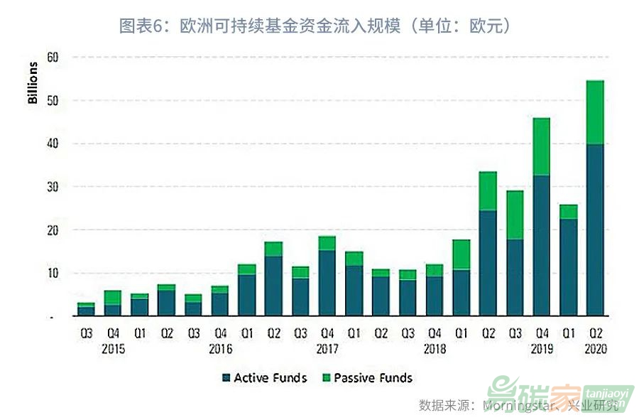 新冠疫情后全球投資者對ESG投資的熱情提升,晨星公司(Morningstar)發(fā)布的數(shù)據(jù)顯示,在Covid-19危機之后歐洲投資者對ESG投資的興趣日益提升,2020年第二季度,流入可持續(xù)(ESG)基金的資金規(guī)模強勢反彈,比第一季度增加了一倍多,達到546億歐元[12]。在歐洲,將ESG標準納入證券篩選關(guān)鍵步驟的基金數(shù)量已從3月底的2584只躍升至6月末的2703只,此外,資產(chǎn)管理公司正在“綠化”他們的產(chǎn)品,在2020年第二季度中,有40只傳統(tǒng)基金轉(zhuǎn)變?yōu)榱丝沙掷m(xù)基金[13]。