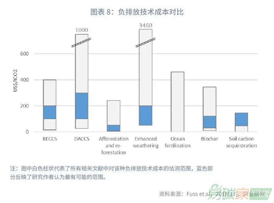 在負排放方面,為了實現(xiàn)二氧化碳凈零排放,需要采取一些負排放措施與技術(shù),比如植被恢復、大氣二氧化碳捕捉等,來抵消無法減少的碳排放。二氧化碳負排放可以通過加強自然碳匯、采用碳捕獲與封存(CCS)等技術(shù)手段或兩者相結(jié)合的方式來實現(xiàn)。加強自然碳匯主要是指通過植樹造林、森林管理、植被恢復等措施,利用植物光合作用吸收大氣中的二氧化碳,并將其固定在植被和土壤中,從而實現(xiàn)負排放的過程。除了自然碳匯外,其他負排放措施還包括生物質(zhì)能-碳捕獲和封存(BECCS)、直接空氣碳捕獲和封存(DACCS)技術(shù)、生物炭、增強風化、海洋堿化和海洋施肥等。目前絕大部分的負排放技術(shù)都處于發(fā)展初期階段,成本較高,有效性也尚待驗證。其中,BECCS通常與植樹造林一起被視為可以永久從大氣中清除二氧化碳以實現(xiàn)《巴黎協(xié)定》目標的兩種主要方式,而其他的生物炭、增強風化、海洋堿化和海洋施肥等負排放方式,在吸收和儲存二氧化碳的潛力、有效性和可擴展性方面仍然存在不確定性,并且成本也相對較高,尚需進一步的研究和大規(guī)模實地試驗。
