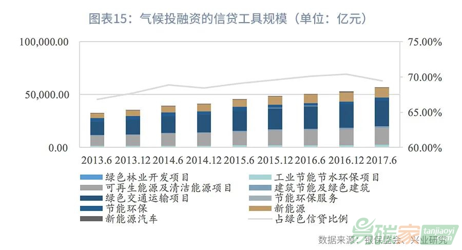 氣候融資占比呈現(xiàn)逐漸上升的趨勢。之前我國由于沒有氣候投融資的標準和統(tǒng)計制度,我們將21家主要銀行綠色信貸余額統(tǒng)計表中對二氧化碳減排具有明顯貢獻的綠色信貸項目認定為氣候投融資支持的相關(guān)項目。將氣候投融資信貸工具規(guī)模定義為“對二氧化碳減排量具有明顯貢獻的綠色信貸項目+綠色信貸戰(zhàn)略新興產(chǎn)業(yè)制造端貸款”,同時,篩選大項目下的對于二氧化碳減排量的明顯貢獻的細分子項目,從而形成各個大項目的不同權(quán)重。根據(jù)此測算方法,2013年6月至2017年6月,氣候投融資信貸工具余額占綠色信貸余額的比例持續(xù)增加,大約從66%增加至70%左右。其中2017年6月氣候投融資信貸余額為5.7萬億元,占全部綠色信貸余額的69.5%,假設2019年氣候投融資信貸工具規(guī)模占綠色信貸余額的比例保持在70%,預計2019年氣候投融資信貸余額將超過7萬億元。從投放領(lǐng)域來看,氣候投融資的信貸余額主要投向綠色交通運輸項目、可再生能源及清潔能源項目、新能源制造端、工業(yè)節(jié)能節(jié)水環(huán)保項目。