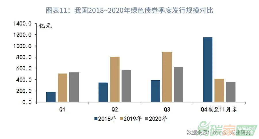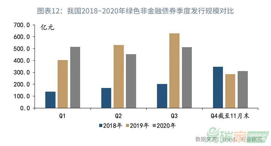 根據(jù)Wind綠色債券概念板塊統(tǒng)計,截至2020年11月末,我國境內(nèi)市場貼標綠色債券累計發(fā)行規(guī)模為11315.34億元,存量規(guī)模8689.18億元。2020年以來,受新冠疫情影響,我國綠色債券市場發(fā)行明顯放緩,其中,2020年1~11月發(fā)行規(guī)模為2070.79億元,較2019年同期(2612.36億元)減少20.7%。從季度發(fā)行規(guī)模來看(見圖表11),2020年除了第一季度發(fā)行規(guī)模略高于2019年以外,從第二季度其都明顯低于2019年。但是,如果除去綠色金融債券,我國綠色非金融債券發(fā)行已開始回暖,第四季度截至11月末發(fā)行規(guī)模已同比轉(zhuǎn)正(見圖表12),而自2019年以來,我國綠色債券市場結(jié)構(gòu)已經(jīng)開始發(fā)生轉(zhuǎn)變,非金融債券發(fā)行占比超過金融債券,2020年綠色非金融債券發(fā)行規(guī)模占比已達86%,比2019年還要高13個百分點。
