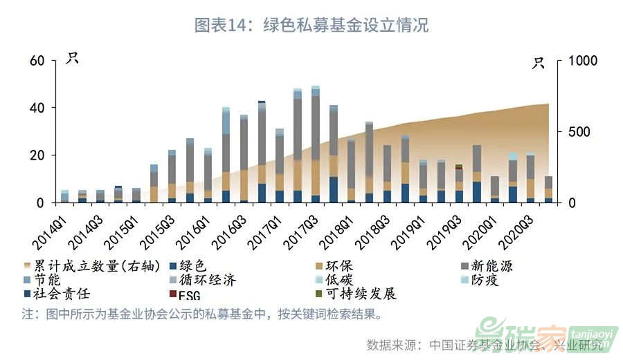 綠色私募基金方面,根據(jù)中國證券投資基金業(yè)協(xié)會公示的私募基金,按關(guān)鍵詞檢索結(jié)果,截至2020年12月2日,我國綠色私募基金設立數(shù)量合計697只,其中冠名綠色、環(huán)保、新能源、節(jié)能、循環(huán)經(jīng)濟、低碳和防疫的基金分別為105、156、360、44、16、8和4只。2020年以來新設立的基金數(shù)量為64只,是2019年全年新設立只數(shù)的84%??梢钥吹?,2017年4季度以來,綠色私募基金設立數(shù)量有明顯的減少,這主要與2017年以來,對地方政府債務的嚴監(jiān)管加強了對政府出資產(chǎn)業(yè)基金的規(guī)范,以及特別是《資管新規(guī)》的出臺,限制了金融機構(gòu)投資于產(chǎn)業(yè)基金緊密相關(guān)。