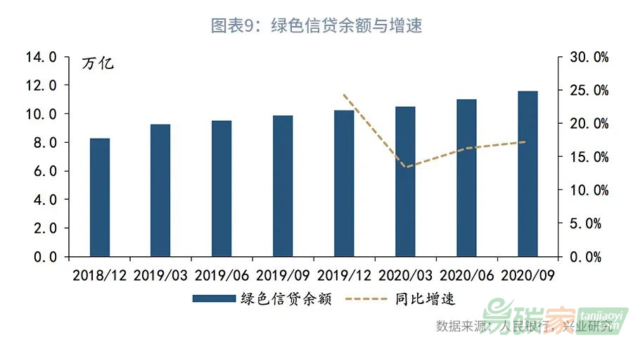 根據(jù)人民銀行發(fā)布的金融機構(gòu)貸款投向報告,截至2020年三季度末,本外幣綠色貸款余額11.55萬億元,比年初增長16.3%,同比增長了17.3%,同比增速比同期各項貸款增速高4.3個百分點。其中單位綠色貸款余額11.51萬億元,占同期企事業(yè)單位貸款的10.5%。分用途看,基礎(chǔ)設施綠色升級產(chǎn)業(yè)貸款和清潔能源產(chǎn)業(yè)貸款余額分別占比為48.1%和26.7%。分行業(yè)看,交通運輸、倉儲和郵政業(yè)綠色貸款余額3.52萬億元,比年初增長9.9%;電力、熱力、燃氣及水生產(chǎn)和供應業(yè)綠色貸款余額3.33萬億元,比年初增長10.3%。