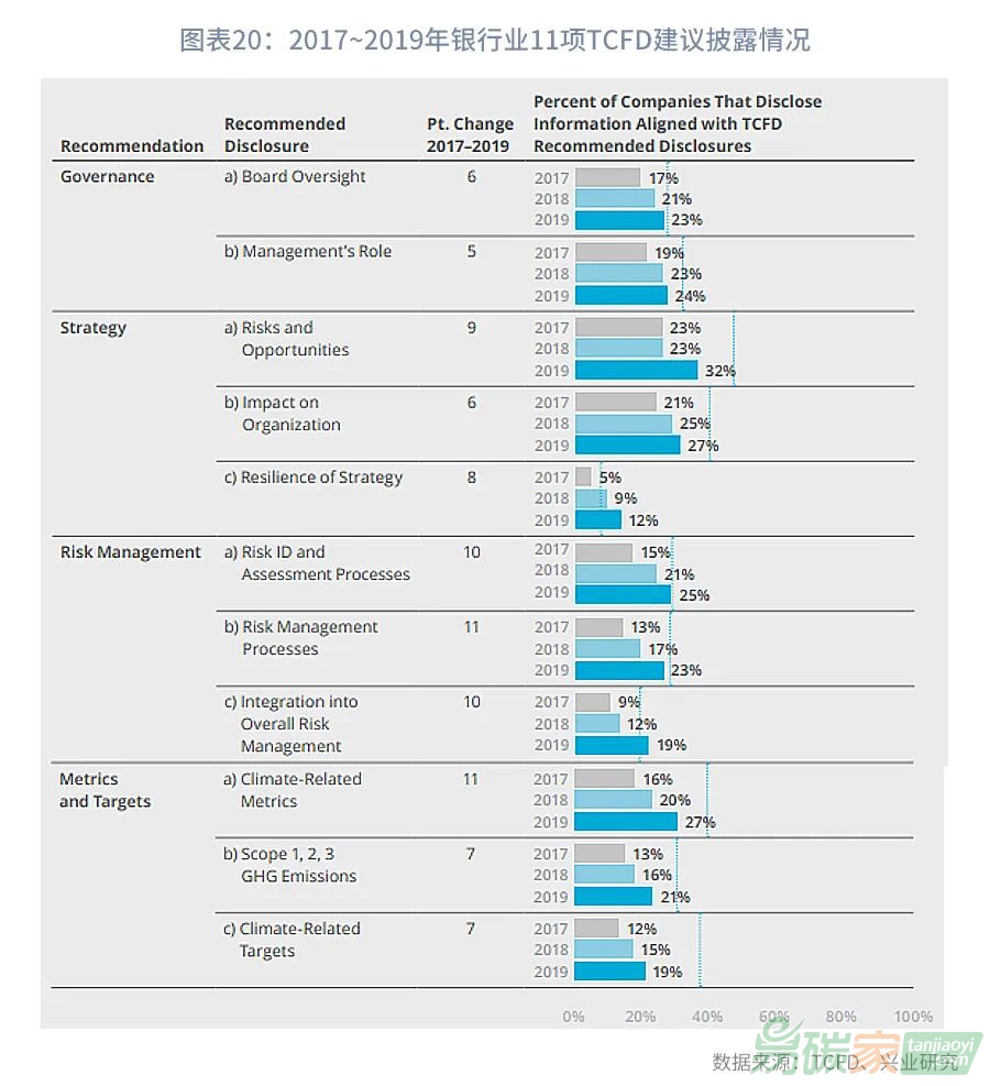 在該報告中,TCFD審查了286家銀行業(yè)機構(gòu)的氣候相關(guān)財務信息披露情況,包括三個子行業(yè):區(qū)域性銀行、大型多樣化銀行、投資和資產(chǎn)管理公司,資產(chǎn)規(guī)模從約100億美元到4.4萬億美元不等,資產(chǎn)規(guī)模中值接近540億美元。從2017年到2019年,在所有的11項TCFD建議披露信息中,銀行的披露比例均有所增加,其中披露比例增長最為顯著的為風險管理流程和與氣候相關(guān)的指標,均提升了11個百分點,這表明銀行越來越多地披露其管理氣候相關(guān)風險的程序以及它們使用的氣候相關(guān)指標。