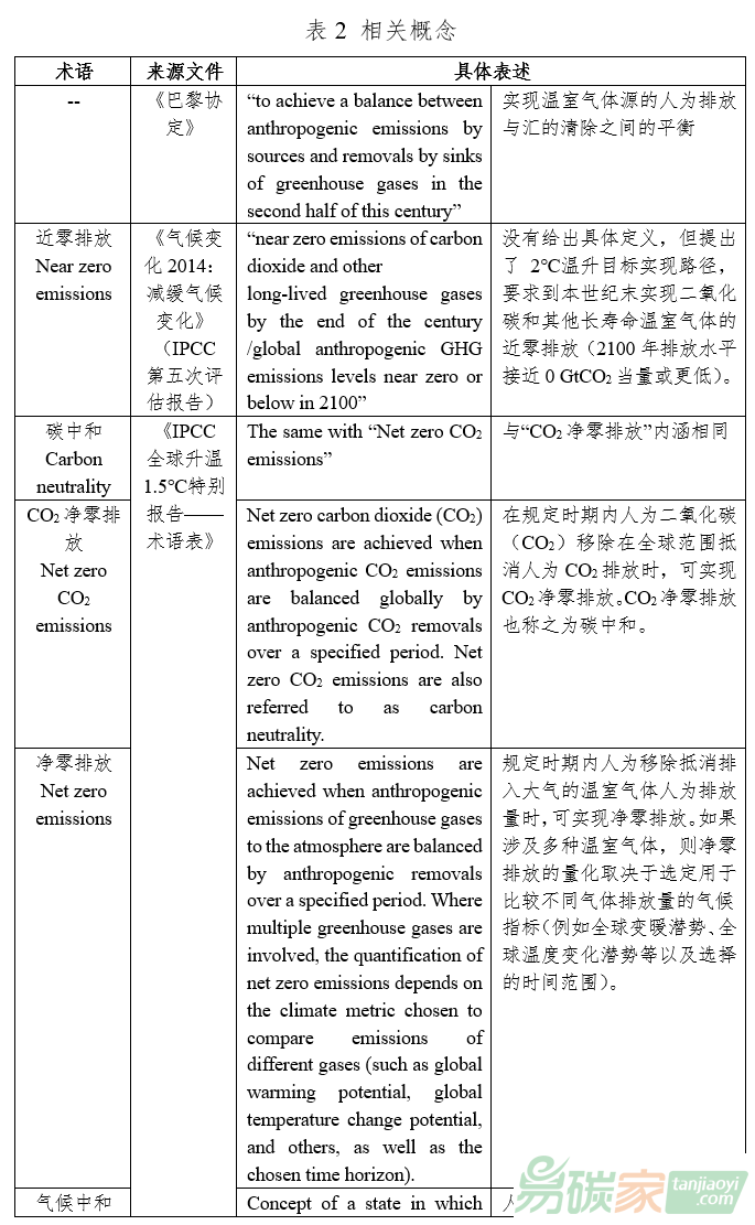 可以看出,各國應(yīng)對氣候變化的目標(biāo)主要表述形式包括“碳中和”、“凈零排放”以及“氣候中和(或譯為氣候中性)”。此外,我們還經(jīng)常會在媒體或文章中看到“近零排放”的表達(dá)。為澄清相關(guān)概念在內(nèi)涵上的區(qū)別,本文在表2中梳理了官方文件中上述概念的具體定義。
