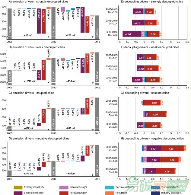 最后,研究對不同脫鉤程度城市的碳排放變化與其脫鉤指數(shù)做了驅(qū)動(dòng)因素分析。研究發(fā)現(xiàn),經(jīng)濟(jì)結(jié)構(gòu)對減排和脫鉤的影響有限,即使污染嚴(yán)重的資源型城市或低收入城市也可以實(shí)現(xiàn)經(jīng)濟(jì)增長與碳排放的脫鉤,向服務(wù)業(yè)的經(jīng)濟(jì)結(jié)構(gòu)轉(zhuǎn)型并非實(shí)現(xiàn)脫鉤的唯一條件。通過提高生產(chǎn)效率以降低排放強(qiáng)度,是實(shí)現(xiàn)碳減排和脫鉤的最重要驅(qū)動(dòng)力,在強(qiáng)脫鉤城市中甚至可以抵消由于經(jīng)濟(jì)增長帶來的排放增加量。