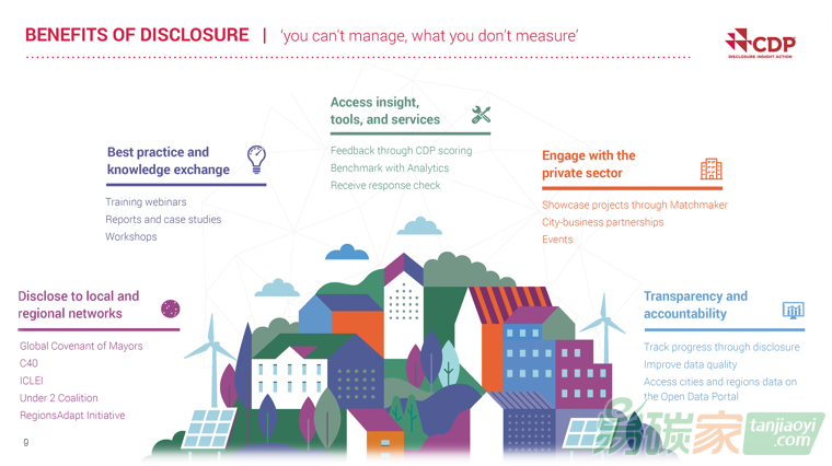 重點(diǎn)行業(yè)和部門(mén)的相關(guān)氣候行動(dòng)信息,包括能源、食品、交通、水和森林等。對(duì)于包括城市在內(nèi)的地方政府來(lái)說(shuō),披露氣候信息除了能夠履行其參與相關(guān)氣候行動(dòng)網(wǎng)絡(luò)所規(guī)定的報(bào)告義務(wù)外,還可以獲得很多益處,如了解更多應(yīng)對(duì)氣候變化相關(guān)的前沿觀點(diǎn),獲得先進(jìn)的管理工具以及服務(wù),包括基于CDP評(píng)分標(biāo)準(zhǔn)的反饋信息等;交流知識(shí)與最佳實(shí)踐,CDP會(huì)基于數(shù)據(jù)分析編寫(xiě)報(bào)告和案例研究,組織有關(guān)的培訓(xùn)研討會(huì)和工作坊;加強(qiáng)與私人部門(mén)合作,通過(guò)CDP搭建的Matchmaker City-business Partnership宣傳和展示氣候友好項(xiàng)目,以吸引更多的可持續(xù)投融資。