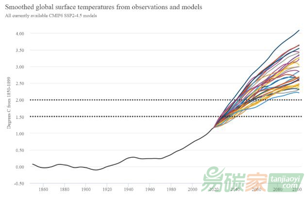 簡(jiǎn)單地在每個(gè)模型中使用自工業(yè)化前時(shí)期以來的變暖量來確定何時(shí)超過1.5℃和2℃的限值是非常具有誤導(dǎo)性的,因?yàn)橐恍┠P鸵锤吖懒耸澜缃?jīng)歷的實(shí)際變暖量,要么低估了它。因此,與其從十九世紀(jì)就開始使用模型預(yù)測(cè)數(shù)據(jù),不如利用從過去到現(xiàn)在的觀測(cè)溫度,然后再模擬不同氣候模型下,未來的溫升數(shù)值。下圖展示了這個(gè)方法,2020年前,使用了平滑平均觀測(cè)溫度記錄,之后使用在不同情景下不同的CMIP6氣候模型模擬數(shù)據(jù)。