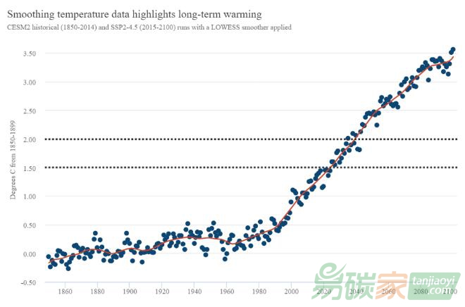 下圖顯示了在 CESM2模型中模擬出當(dāng)前全球氣溫已溫升1.4℃,而真實(shí)觀測(cè)溫度的溫升為1.2℃。這意味著溫升超過1.5℃的年份更多是由于“倒推”模型和觀測(cè)溫度之間的歷史不匹配,而不是未來預(yù)期變暖的速度。