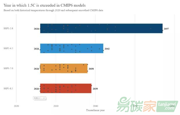 結(jié)果顯示,在所有的CMIP6模型下,全球氣溫都預(yù)計(jì)將要超過(guò)1.5℃限值,條形圖表示某一特定SSP方案的“超越數(shù)”日期的全部范圍,黑點(diǎn)則表示所有個(gè)別模型的估計(jì)值。