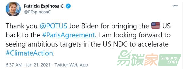 《聯(lián)合國氣候變化框架公約》執(zhí)行秘書Patricia Espinosa感謝美國總統(tǒng)喬·拜登使美國重返《巴黎協(xié)定》,她表示:“我期待看到美國國家自主貢獻(xiàn)(NDC)加快氣候行動(dòng)的雄心勃勃的目標(biāo)?!?/div>