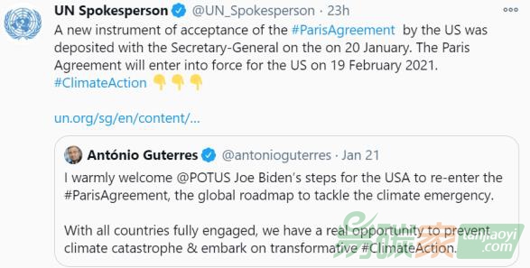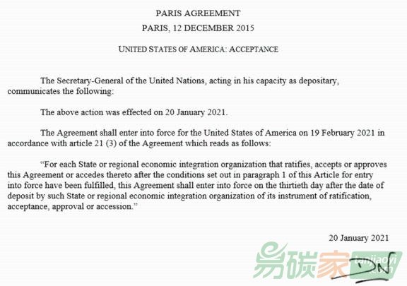 1月20日,美國向聯(lián)合國秘書長交存了一份新的美國接受《巴黎協(xié)定》的文書,表示同意接受該協(xié)定的約束。