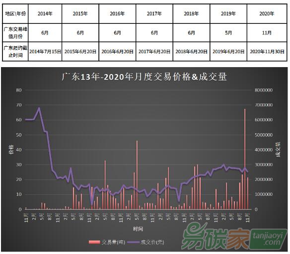 廣東配額市場(chǎng)交易量峰期出現(xiàn)在履約截止日期的當(dāng)月或前一月。
