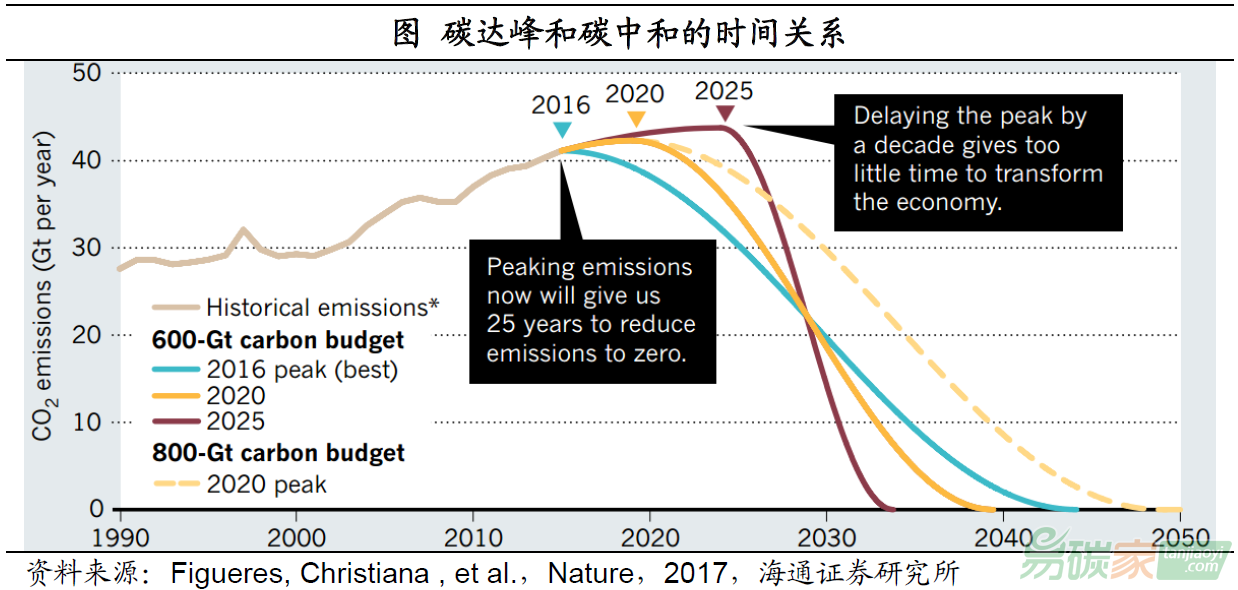 那么二者在時(shí)間上是什么樣的關(guān)系?根據(jù)Figueres等學(xué)者的測(cè)算,如果2016年實(shí)現(xiàn)碳達(dá)峰,仍需隨后的25年時(shí)間達(dá)到碳中和。倘若碳達(dá)峰的時(shí)間不斷延緩,而要完成控制氣溫提升的計(jì)劃,需要碳中和在更短的時(shí)間內(nèi)實(shí)現(xiàn),難度也將加劇。這也說(shuō)明為了盡快實(shí)現(xiàn)碳中和,全球減碳需提速。