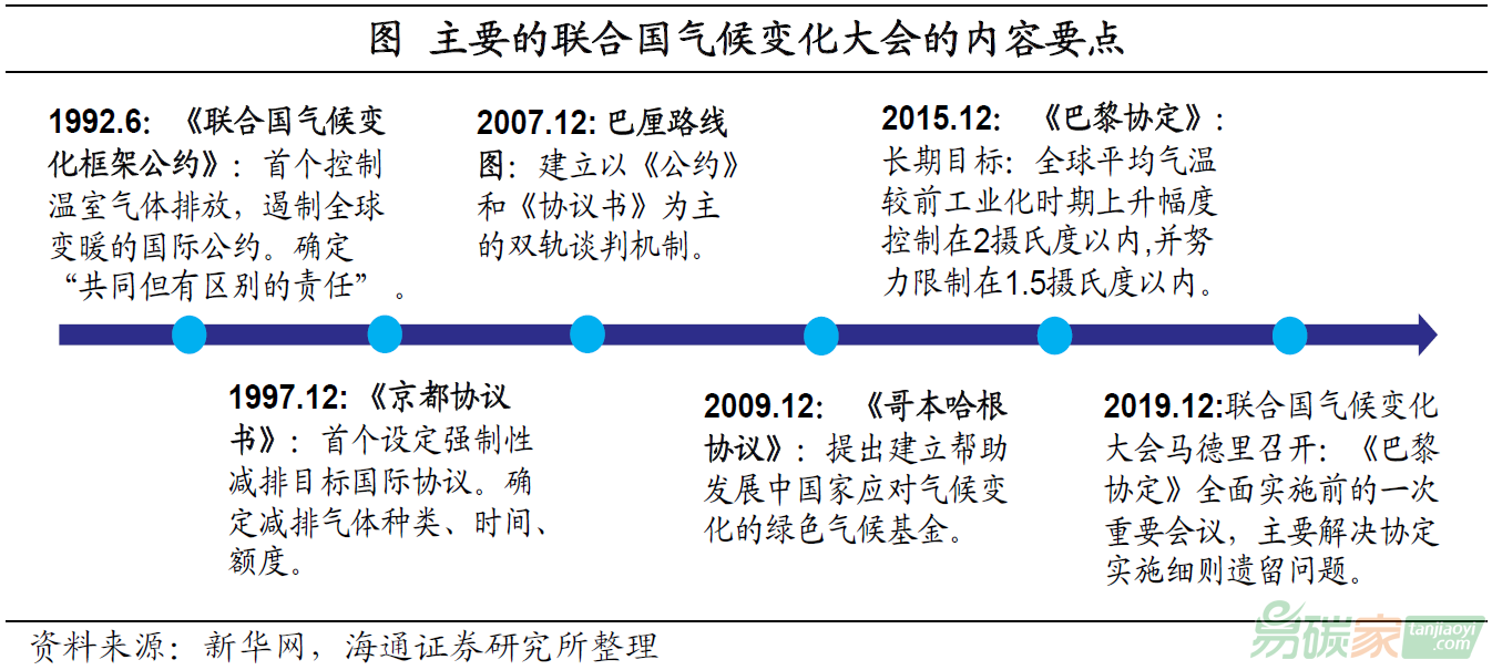 減排應(yīng)協(xié)同。面對(duì)全球變暖帶來(lái)的威脅,世界各國(guó)意識(shí)到協(xié)同治理的重要性,而近些年的聯(lián)合國(guó)氣候大會(huì)正是聚焦于此。在1992年的大會(huì)上,150多個(gè)國(guó)家簽署《聯(lián)合國(guó)氣候變化框架公約》,作為首個(gè)控制溫室氣體排放的國(guó)際公約,它明確了“共同但有區(qū)別責(zé)任”,即發(fā)達(dá)國(guó)家率先減排,同時(shí)為發(fā)展中國(guó)家提供技術(shù)資金支持。隨后1997年《京都協(xié)議書(shū)》的簽署進(jìn)一步明確減排氣體的種類以及額度。