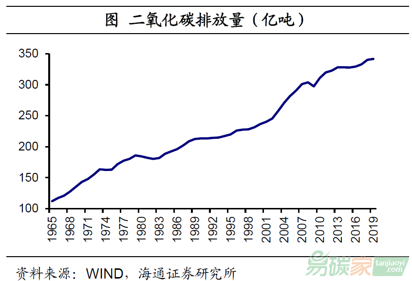 碳排放強(qiáng)度不減,氣候變暖威脅襲來(lái)。進(jìn)入工業(yè)化時(shí)代,全球二氧化碳(CO2)的排放強(qiáng)度急劇提升。2019年全球CO2排放量達(dá)到341.7億噸,是1965年的3.1倍,尤其是2000年以來(lái)增速明顯提升。隨著CO2濃度的短期劇增,全球氣溫快速升高。而一旦氣候加速變暖,風(fēng)暴、熱浪等極端天氣頻繁襲來(lái),不僅危及人類生活,也會(huì)造成較大規(guī)模的經(jīng)濟(jì)損失。