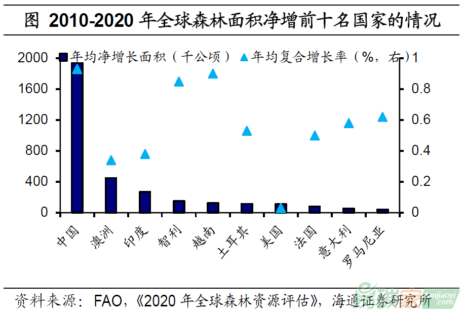如何增強生態(tài)碳匯強度?關鍵在于提升國土綠化面積。近年來,中國的綠化取得了顯著的進展。從全球范圍看,10年至20年中國森林面積年均凈增193.7萬公頃,位居全球首位,是緊隨其后的澳洲和印度的4.3倍和7.3倍。而從增速看,中國也以0.93%的年均復合增長率遙遙領先。
