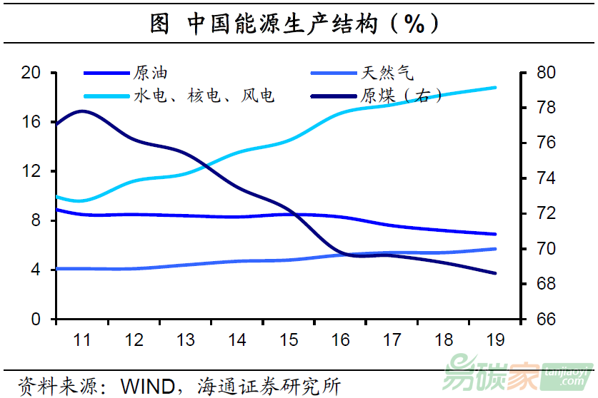 難題?;乜粗袊茉吹慕Y構,在生產(chǎn)端,原煤和原油合計占比從2011年的86.3%降至2019年的75.5%。在消費端,石化能源的比重更是逐步回落。相應地,無論是生產(chǎn)結構還是消費結構,水電、核電等清潔能源的占比均顯著回升。