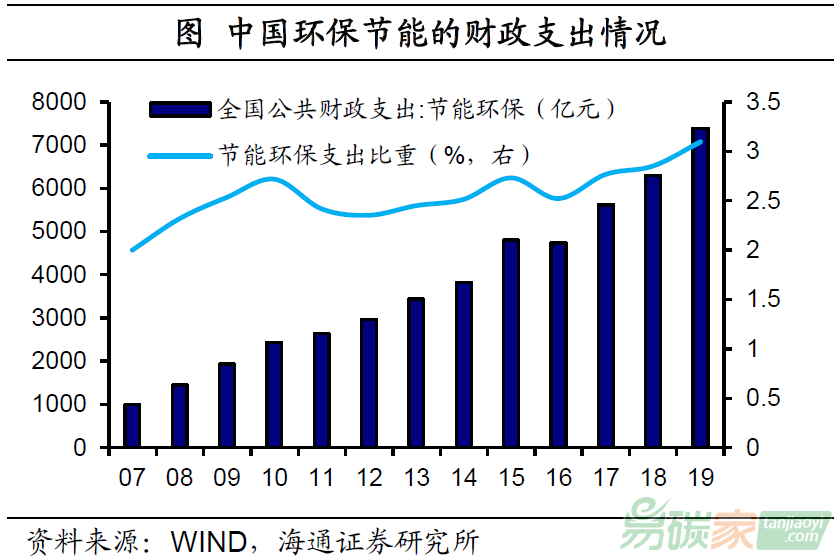 節(jié)能環(huán)保的投入力度增強。2007年中國投向節(jié)能環(huán)保領域的財政支出僅為995.8億元,而在2019年已增至7390.2億元,占總支出的比重也由2%升至3.1%。