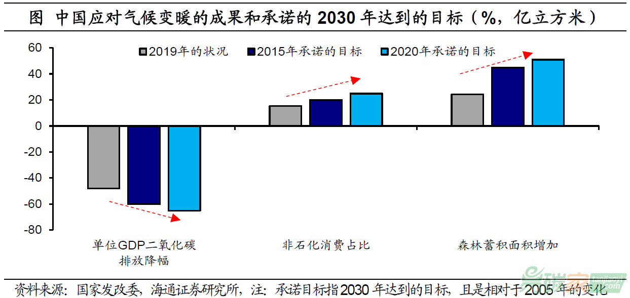 然而,應(yīng)對氣候升溫的任務(wù)仍較艱巨,而我國也在低碳建設(shè)方面提出了更高標(biāo)準(zhǔn)。2015年11月聯(lián)合國氣候大會召開,中國承諾在2030年單位GDP二氧化碳排放相比于2005年降幅不低于60%。在2020年12月舉行的氣候雄心峰會上,中國進(jìn)一步承諾將這一強(qiáng)度降低65%。非石化能源消費(fèi)的占比和森林蓄積面積也分別由2015年承諾的20%和45億立方米升至25%和60億立方米。從當(dāng)前的情況看,中國在低碳方面取得了長足進(jìn)展,但是距離新的承諾目標(biāo)仍有差距。這也意味著為了盡快實(shí)現(xiàn)