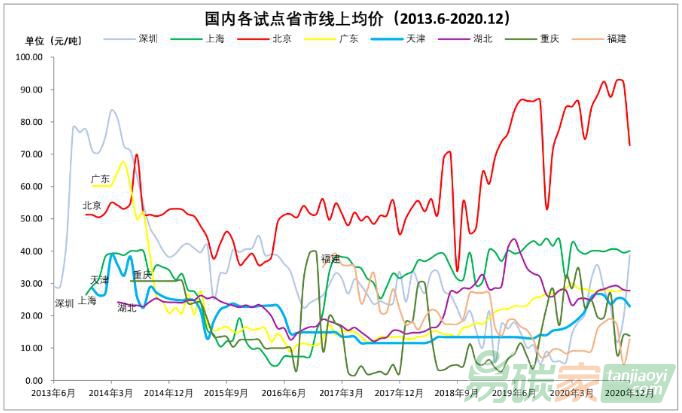 圖為國內(nèi)各試點(diǎn)省市線上均價(來源:天津排放權(quán)交易所)