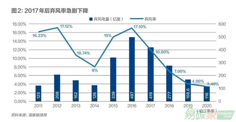棄風棄光一度是困擾中國新能源發(fā)展的關鍵問題,2016年前后,棄風率一度超過30%,2017年之后雖然迅速緩解,但在未來更高比例的新能源裝機下,消納隱憂依然揮之不去。