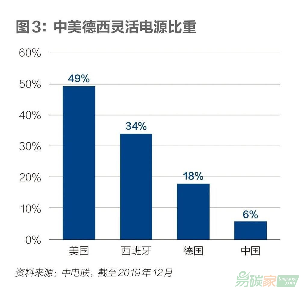 中電聯(lián)2019年12月發(fā)布的《煤電機組靈活性運行政策研究》顯示,歐美國家的靈活電源比重普遍較高,西班牙、德國、美國占比分別為34%、18%、49%,而中國占比不到6%。在中國新能源資源富集的三北地區(qū),風電、太陽能發(fā)電裝機分別占全國的72%、61%,但靈活調(diào)節(jié)電源還不足3%。