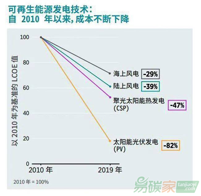 過去十年,光伏和風電的度電成本分別下降了約八成和四成,且仍有進一步下降空間。