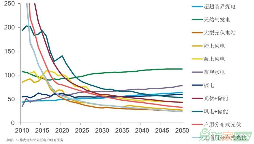 據(jù)國際能源咨詢公司伍德麥肯茲近期發(fā)布的報告,未來十年,火電的成本還將上升,光伏、風電則有40%~50%的成本下降空間。2035年是一個分水嶺,屆時中國所有可再生能源發(fā)電的成本都將比煤電低。如果再加上為碳排放支付的費用,煤電成本將高出10%~15%。