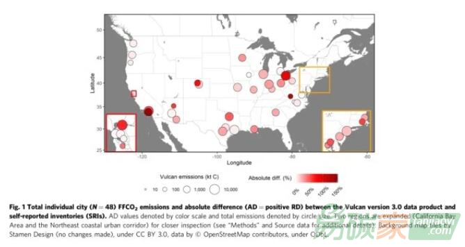 研究團(tuán)隊(duì)將上述報(bào)告與他們最近完成的、以研究為驅(qū)動(dòng)的Vulcan 3.0版本的美國(guó)化石燃料二氧化碳(FFCO2)排放估算進(jìn)行了比較。Vulcan使用大量公開可用的輸入數(shù)據(jù)集,對(duì)2010-2015年全美范圍內(nèi)的二氧化