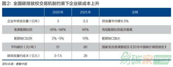 中國碳市場體系尚在起步階段,據(jù)德勤中國研究數(shù)據(jù)預測,伴隨時間的推移,到2025年,配額缺口比例將從2%上升到10%,再考慮到未來有償分配比例上升,全國平均碳價將從2020年的51元/噸上升到86元/噸,企業(yè)碳排放履約成本進一步上升(圖2)?!?020碳價調查報告》認為,全國碳市場建成后,到2030年碳價有望達到93元/噸,并于本世紀中葉超過167元/噸。