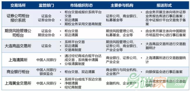 衍生品市場(chǎng)有證券公司柜臺(tái)市場(chǎng)和報(bào)價(jià)系統(tǒng)、期貨風(fēng)險(xiǎn)管理公司柜臺(tái)市場(chǎng)、大連商品交易所商品互換平臺(tái)、上海清算所、商業(yè)銀行柜臺(tái)市場(chǎng)以及上海黃金交易所。