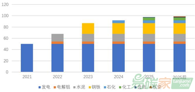 圖1 全國碳市場重點(diǎn)碳排放行業(yè)納入順序及規(guī)模變化預(yù)估圖(單位:億噸)