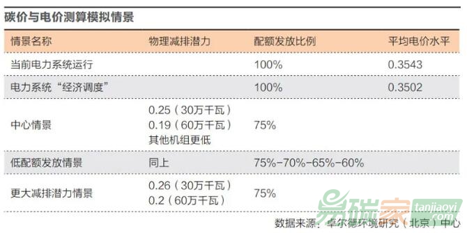 北京)中心對(duì)碳市場(chǎng)中碳價(jià)與電價(jià)的變化進(jìn)行了模擬情景測(cè)算。在發(fā)放排放總量75%配額的情況下,市場(chǎng)形成了200元/噸的碳價(jià)格。但是,機(jī)組并不會(huì)在很大程度上通過減少發(fā)電量減少排放,因此
