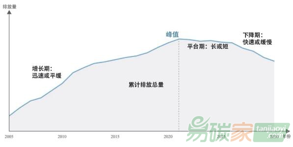 城市碳達峰是指城市的二氧化碳排放(以年為單位)在一段時間內(nèi)達到峰值,之后進入平臺期并可能在一定范圍內(nèi)波動,然后進入平穩(wěn)下降階段(圖1)。由于經(jīng)濟因素、極端氣象自然因素等,視情況可以適度允許城市在平臺期內(nèi)出現(xiàn)碳排放上升的情況,但不能超過峰值碳排放量。