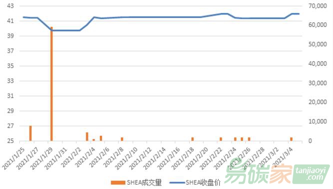 本報告期內(nèi)(2021年3月1日至2021年3月5日),上海碳配額(SHEA)現(xiàn)貨市場成交有所下降,其中線上成交2,000噸,協(xié)議轉(zhuǎn)讓無成交。本周SHEA成交較為清淡,僅在周四有交易達成;價格方面,SHEA稍有上揚,周四重回42.00元/噸,并維持至周五,報收42.00元/噸,較上周五收盤價同比上漲0.65元/噸(如圖1)。
