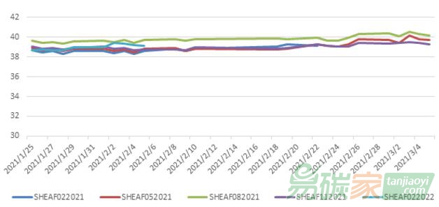 本報告期內(nèi)(2021年3月1日至2021年3月5日),上海碳配額遠期(SHEAF)中央對手清算業(yè)務(wù)保持平穩(wěn)運行。本周遠期市場四個流通協(xié)議價格略有波動,其中2021年5月協(xié)議期末結(jié)算價為39.70元/噸,較上周五同比下跌0.05元/噸,2021年8月協(xié)議期末結(jié)算價40.14元/噸,較上周五同比下跌0.18元/噸(如圖2)。