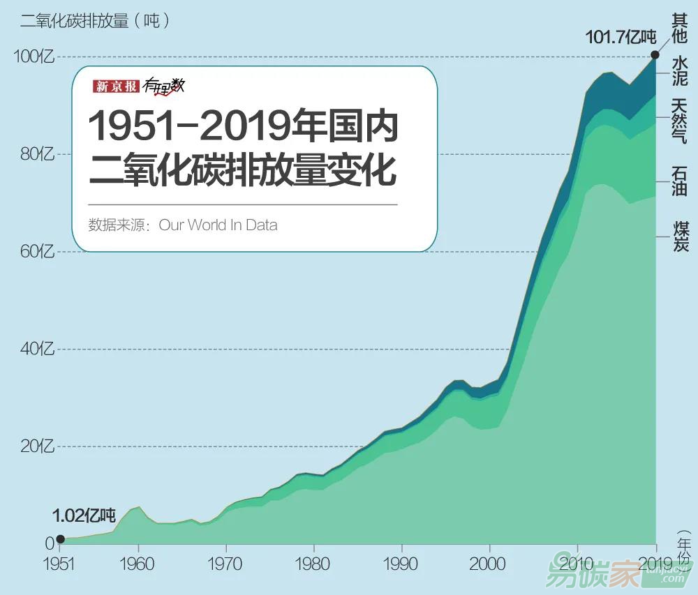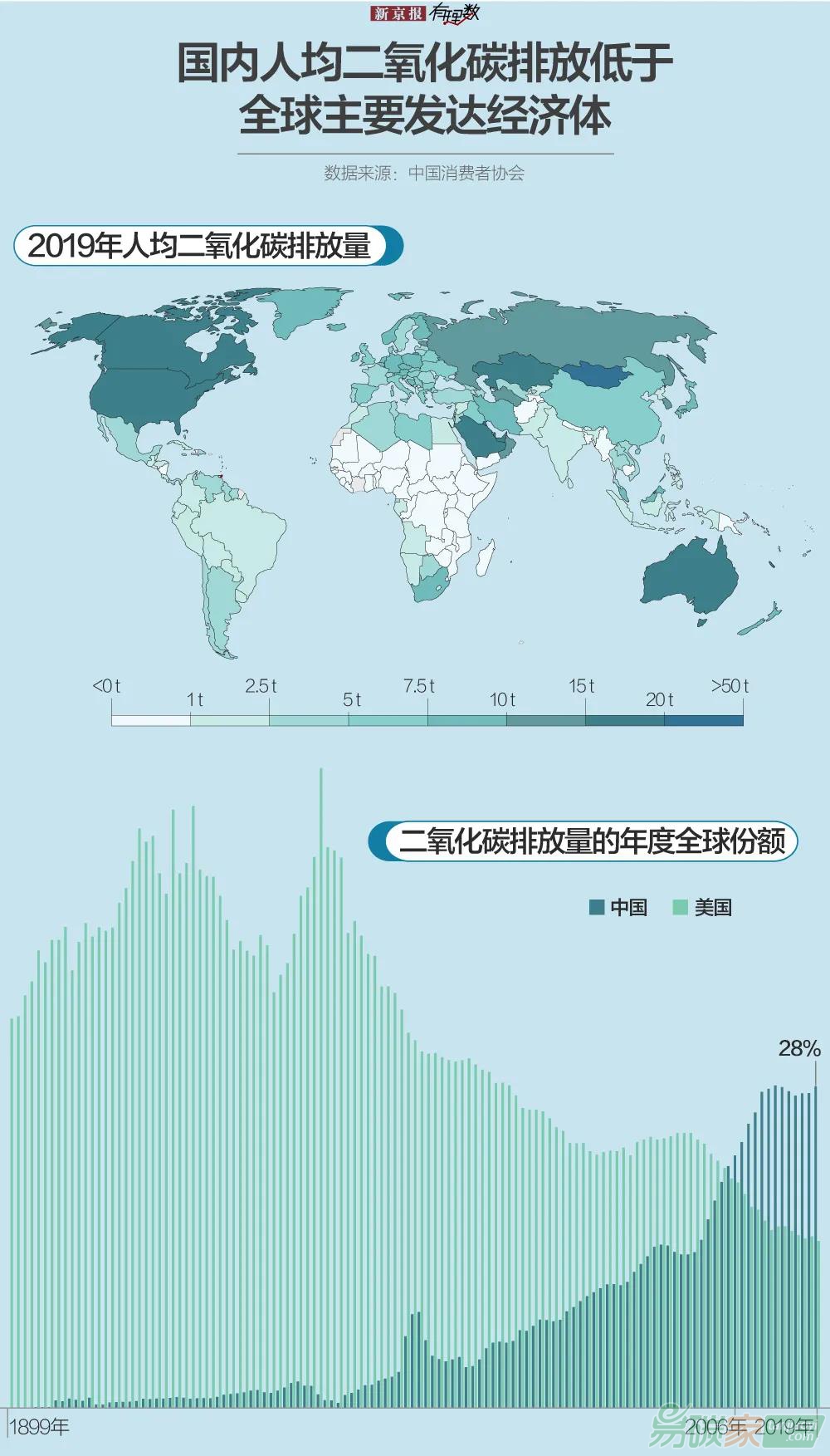 2019年,中國二氧化碳排放量101.7億噸,占全球總量的28%,其次排在第二位的美國52.8億噸,印度26.2億噸全球第三。