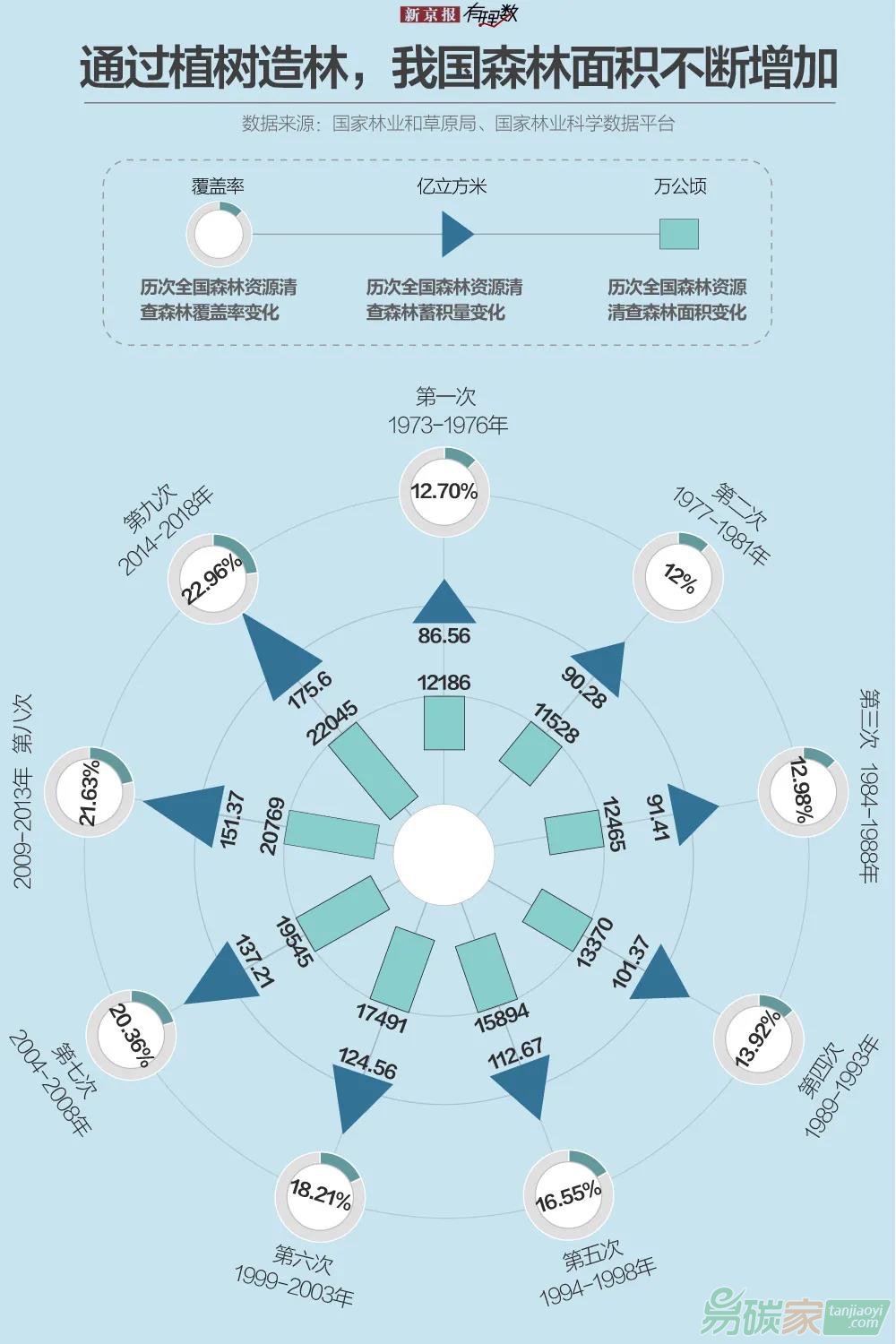 森林面積在1973年到2018年的45年時(shí)間里,增長了98586200平方米,森林覆蓋率從12.7%增長到22.96%。
