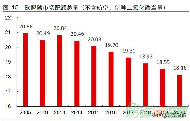 3)配額總量不斷收縮:歐盟碳市場的配額總量從前兩階段的自下而上確認(rèn),轉(zhuǎn)為歐盟 確定統(tǒng)一的排放總量,且在 2013-2020 年和 2021-2030 年分別按照年均下降 1.74%和 2.2%的幅度來收縮,同時設(shè)定市場穩(wěn)定機制(MSR),對流通中的配額總量進行調(diào)控。