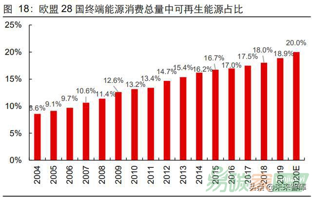 1)能源消費(fèi):歐盟此前制定了 2020 年可再生能源占其終端能源消費(fèi)總量 20%的目標(biāo), 并將該目標(biāo)分配給各個(gè)成員國(guó)執(zhí)行。歐盟 28 個(gè)國(guó)家(含英國(guó))終端能源消費(fèi)中可再生 能源的比例從 2004 年的 8.6%提升至 2019 年的 18.9%,距離完成目標(biāo)值僅差 1.13pct, 從成員國(guó)來(lái)看,已有瑞典、芬蘭等 14 個(gè)國(guó)家已完成目標(biāo)。其中: