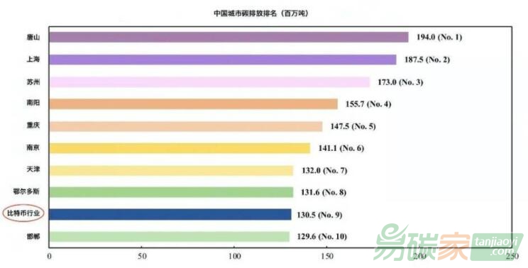 比特幣挖礦的碳排放足以在中國182個(gè)城市中排到前10名。|來源:[1]